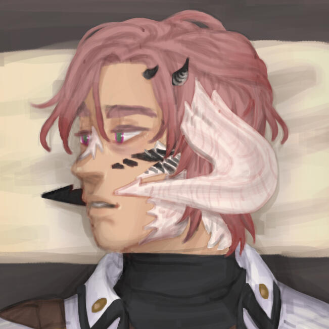 his once-white scales, horns, and tail have become blackened scar-scales in some areas due to injury and severe burns. has sprawling burn scars over his upper back and left shoulder, and various blade and bullet scars.